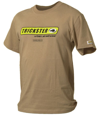 A Tan colour tee featuring a screenprinted Trickster logo on the chest.