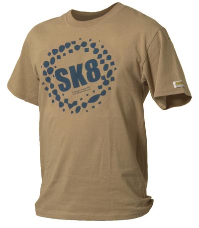 A Tan colour tee featuring a screenprinted SK8 on the chest.